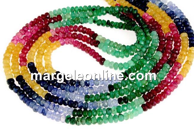 Margele rubine, safire multicolore si smaralde, piatra naturala, forma: rondela fatetata, marime: 3.5x1.8-2.3mm. Pretul este pentru un sirag de 42cm.