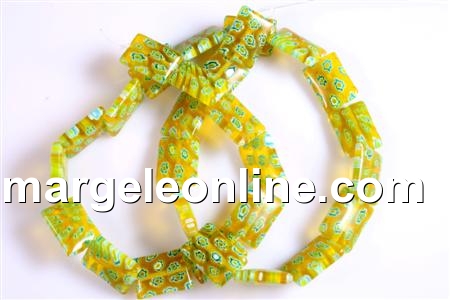 Margele sticla Millefiori, culoare: predominant galben, dimensiune: 14x10mm, forma: pernuta dreptunghiulara. Pretul se refera la 1 sirag de 37-40cm.
