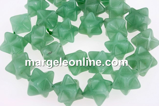 Aventurin verde, dimensiune: 18mm, forma: Hexagrama, Steaua lui David. Merkabah este asociat cu numărul 6."Mer" inseamnă lumină. "Ka" inseamnă spiritul. "Ba" inseamnă organism. Pretul se refera la un sirag cu 25 pietre.