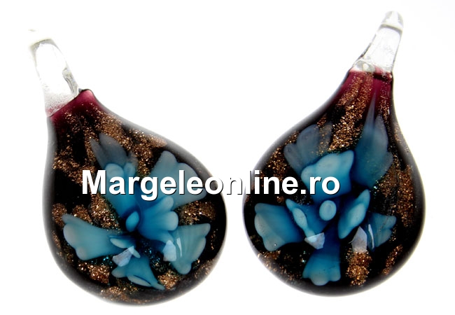 Pandantiv sticla Murano, dimensiune: 35-37x18mm, diametru orificiu prindere: 5mm, forma: picatura. Pretul este pentru 1 bucata, produsul se livreaza fara snur.