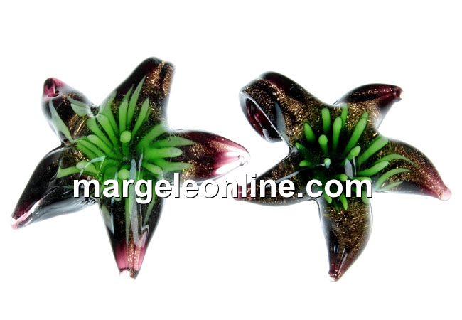 Pandantiv sticla Murano, dimensiune: 27x27mm, diametru orificiu prindere: 5mm, forma de stea de mare. Pretul se refera la 1 bucata, produsul se livreaza fara snur.
