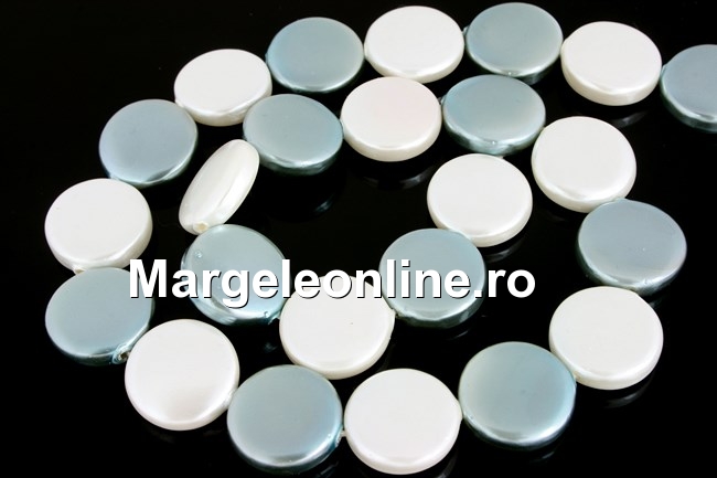 Perle tip Mallorca, forma: banut, culoare: alb-gri petrol, perlele prezinta neregulaitati specifice, dimensiune: 15x5mm. Pretul se refera la 1 sirag de 39-40cm.