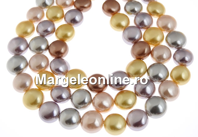 Perle tip Mallorca din cristal acoperite cu straturi de sidef natural, forma: disc, dimensiune: 12x8mm. Pretul se refera la 1 sirag fara incuietoare de 39cm.
