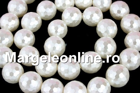Perle tip Mallorca, forma: rotund fatetat, culoare: alb perlat, dimensiune: 12mm. Pretul se refera la 1 sirag cu 32-33 elemente.