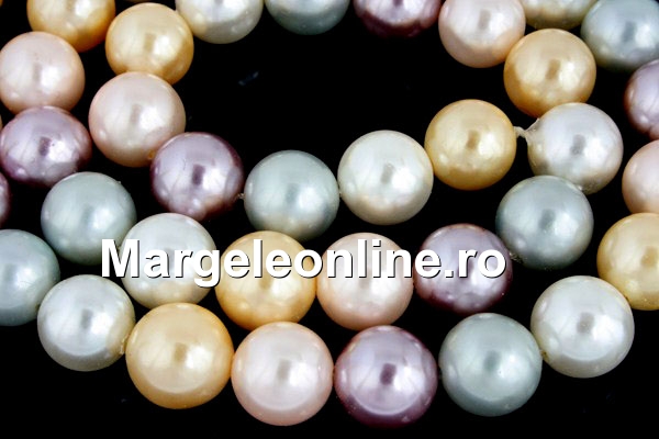 Perle tip Mallorca, forma: rotund, culoare: galben, alb, bleu, roz, mov argintiu, dimensiune: 10mm. Pretul se refera la 1 sirag de 40cm.