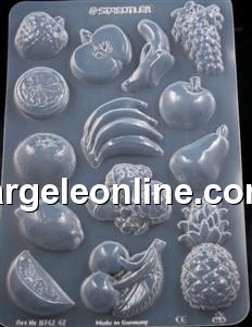 Matrita cu 14 forme si marimi de fructe ( cele din imagine). Ideala pentru fimo dar se poate folosi si pentru ceara, ipsos sau in bucatarie. Pretul se refera la 1 bucata.