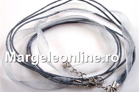 Snur pret-a-porter: lungime: 45cm. Contine: trei randuri de bumbac cerat de 1mm, unul de organza de 7mm in nuante asortate de gri, accesorii de inchidere si prelungire. Pretul se refera la 3 bucati.