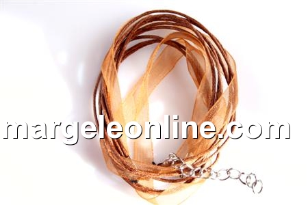 Snur pret-a-porter: lungime: 45cm. Contine: trei randuri de bumbac cerat de 1mm, unul de organza de 7mm in nuante asortate de maro auriu, accesorii de inchidere si prelungire. Pretul se refera la 3 bucati.