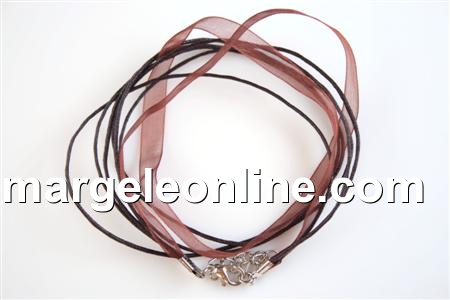 Snur pret-a-porter: lungime: 45cm. Contine: trei randuri de bumbac cerat de 1mm, unul de organza de 7mm in nuante asortate de maro intens, accesorii de inchidere si prelungire. Pretul se refera la 3 bucati.