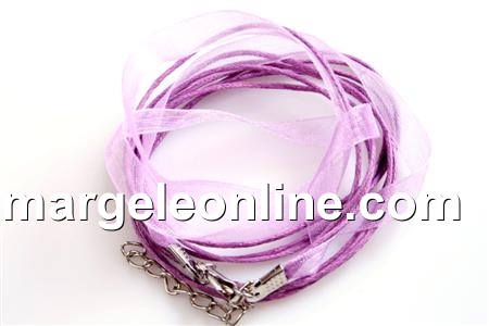 Snur pret-a-porter: lungime: 45cm. Contine: trei randuri de bumbac cerat de 1mm, unul de organza de 7mm in nuante asortate de mov liliac, accesorii de inchidere si prelungire. Pretul se refera la 3 bucati.