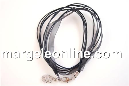 Snur pret-a-porter: lungime: 45cm. Contine: trei randuri de bumbac cerat de 1mm, unul de organza de 7mm in nuante asortate de negru, accesorii de inchidere si prelungire. Pretul se refera la 3 bucati.