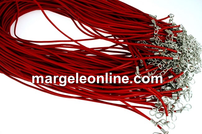 Snur piele naturala, grosime: 1.8mm, culoare: rosu, lungime:44 cm,accesorii de inchidere si prelungire. Pretul se refera la 3 bucati.