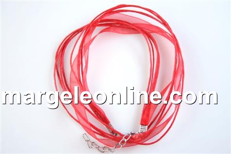 Snur pret-a-porter: lungime: 45cm. Contine: trei randuri de bumbac cerat de 1mm, unul de organza de 7mm in nuante asortate de rosu intens, accesorii de inchidere si prelungire. Pretul se refera la 3 bucati.