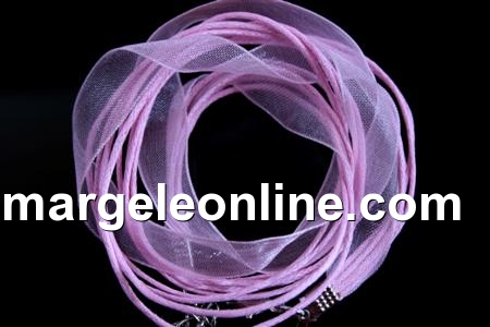 Snur pret-a-porter: lungime: 45cm. Contine: trei randuri de bumbac cerat de 1mm, unul de organza de 7mm in nuante asortate de roz, accesorii de inchidere si prelungire. Pretul se refera la 3 bucati.