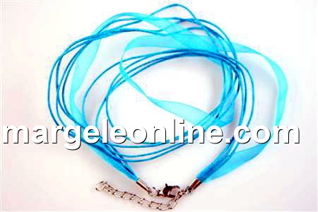 Snur pret-a-porter: lungime: 45cm. Contine: trei randuri de bumbac cerat de 1mm, unul de organza de 7mm in nuante asortate de turcoaz, accesorii de inchidere si prelungire. Pretul se refera la 3 bucati.