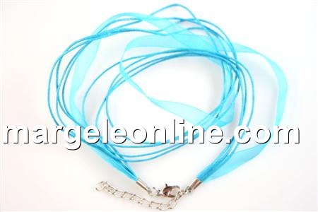 Snur pret-a-porter: lungime: 45cm. Contine: trei randuri de bumbac cerat de 1mm, unul de organza de 7mm in nuante asortate de turcoaz, accesorii de inchidere si prelungire. Pretul se refera la 3 bucati.