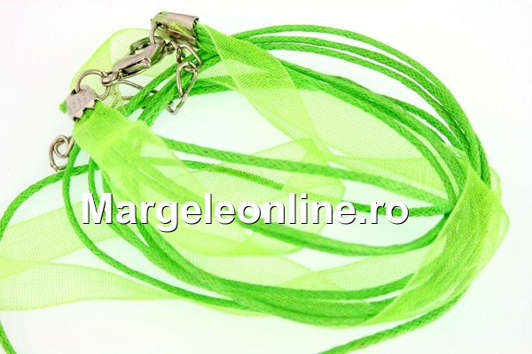 Snur pret-a-porter: lungime: 45cm. Contine: trei randuri de bumbac cerat de 1mm, unul de organza de 7mm in nuante asortate de verde neon, accesorii de inchidere si prelungire. Pretul se refera la 3 bucati.