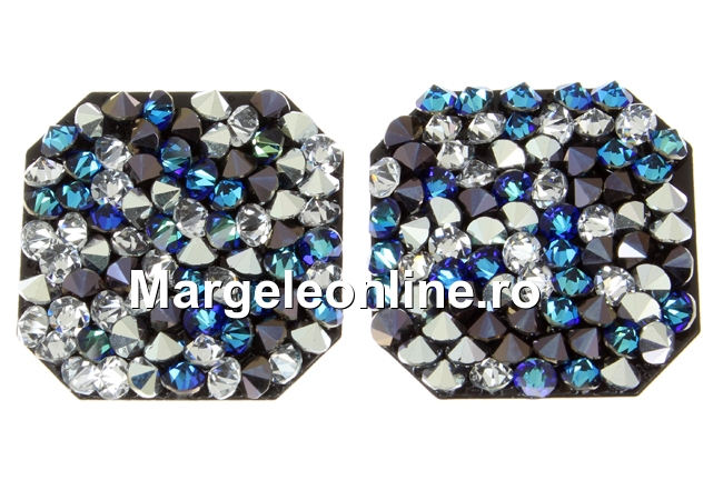 Element Swarovski fine rocks, cabochon, forma: fancy square, dimensiune: 22x22mm. Pretul este pentru 1 bucata. Poate fi perforat DOAR din spate spre fata cu un obiect ascutit si rotunjit de 1-1.5mm (gen un ac gros pentru cusut lana) incat cu accesoriile necesare sa transformati produsul in pandantiv sau cercei, baza din silicon fiind foarte elastica. Deci: trecand obiectul ascutit DOAR din spate spre fata si niciodata invers, din fata spre spate.