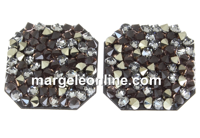 Element Swarovski fine rocks, cabochon, forma: fancy square, dimensiune: 22x22mm. Pretul este pentru 1 bucata. Poate fi perforat DOAR din spate spre fata cu un obiect ascutit si rotunjit de 1-1.5mm (gen un ac gros pentru cusut lana) incat cu accesoriile necesare sa transformati produsul in pandantiv sau cercei, baza din silicon fiind foarte elastica. Deci: trecand obiectul ascutit DOAR din spate spre fata si niciodata invers, din fata spre spate.