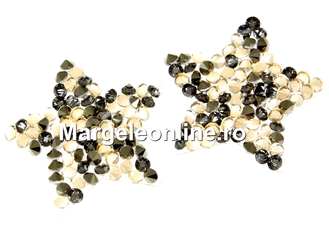 Element Swarovski fine rocks, cabochon, forma: fancy star, dimensiune: 22mm. Pretul este pentru 1 bucata. Poate fi perforat DOAR din spate spre fata cu un obiect ascutit si rotunjit de 1-1.5mm (gen un ac gros pentru cusut lana) incat cu accesoriile necesare sa transformati produsul in pandantiv sau cercei, baza din silicon fiind foarte elastica. Deci: trecand obiectul ascutit DOAR din spate spre fata si niciodata invers, din fata spre spate.