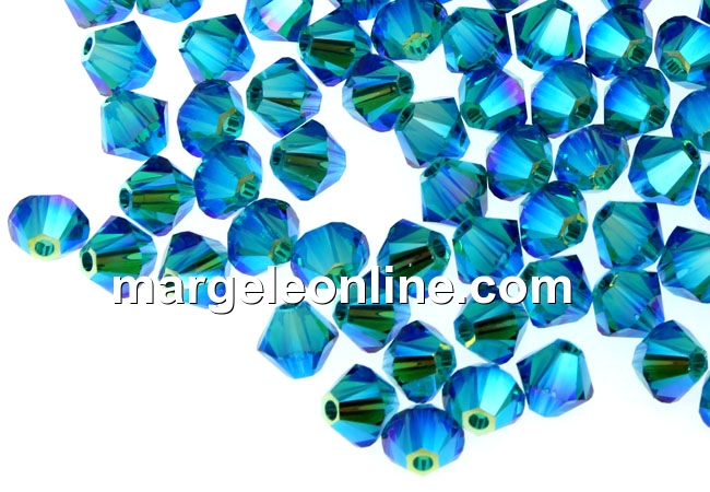 Swarovski, margele bicone, blue zircon AB2x, 4mm - x20