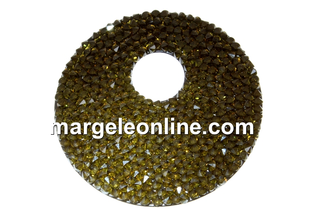 Element Swarovski fine rocks, pandantiv, forma: disc perforat, diametru: 40mm, diametru perforatie: 10mm. Pretul este pentru 1 bucata. Poate fi perforat DOAR din spate spre fata cu un obiect ascutit si rotunjit de 1-1.5mm (gen un ac gros pentru cusut lana) incat cu accesoriile necesare sa transformati produsul in pandantiv sau cercei, baza din silicon fiind foarte elastica. Deci: trecand obiectul ascutit DOAR din spate spre fata si niciodata invers, din fata spre spate.