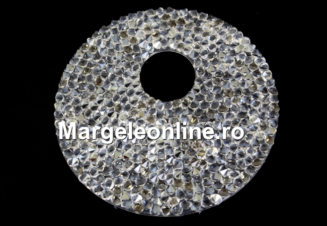 Element Swarovski fine rocks, pandantiv, forma: disc perforat, diametru: 40mm, diametru perforatie: 10mm. Pretul este pentru 1 bucata. Poate fi perforat DOAR din spate spre fata cu un obiect ascutit si rotunjit de 1-1.5mm (gen un ac gros pentru cusut lana) incat cu accesoriile necesare sa transformati produsul in pandantiv sau cercei, baza din silicon fiind foarte elastica. Deci: trecand obiectul ascutit DOAR din spate spre fata si niciodata invers, din fata spre spate.