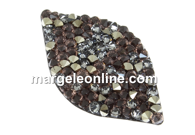 Element Swarovski fine rocks, pandantiv, forma: fancy leaf, dimensiune: 40x23mm. Pretul este pentru 1 bucata. Poate fi perforat DOAR din spate spre fata cu un obiect ascutit si rotunjit de 1-1.5mm (gen un ac gros pentru cusut lana) incat cu accesoriile necesare sa transformati produsul in pandantiv sau cercei, baza din silicon fiind foarte elastica. Deci: trecand obiectul ascutit DOAR din spate spre fata si niciodata invers, din fata spre spate.